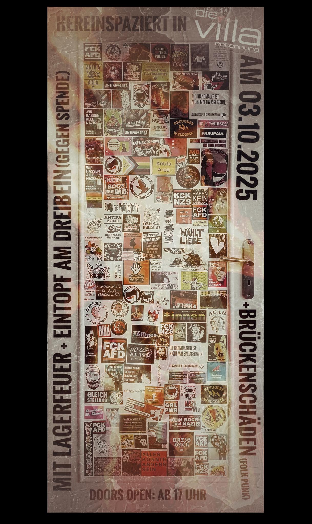 2025 - heute Goethestraße 14, Rotenburg, GermanyFeuer, lecker Essen, und die Band Brückenschäden(folkpunk) sind das Abendprogramm. Kicker, Dart, Bierchen wie üblich inner Kneipe. Mit bunten Grüßen Eure Vila Crew