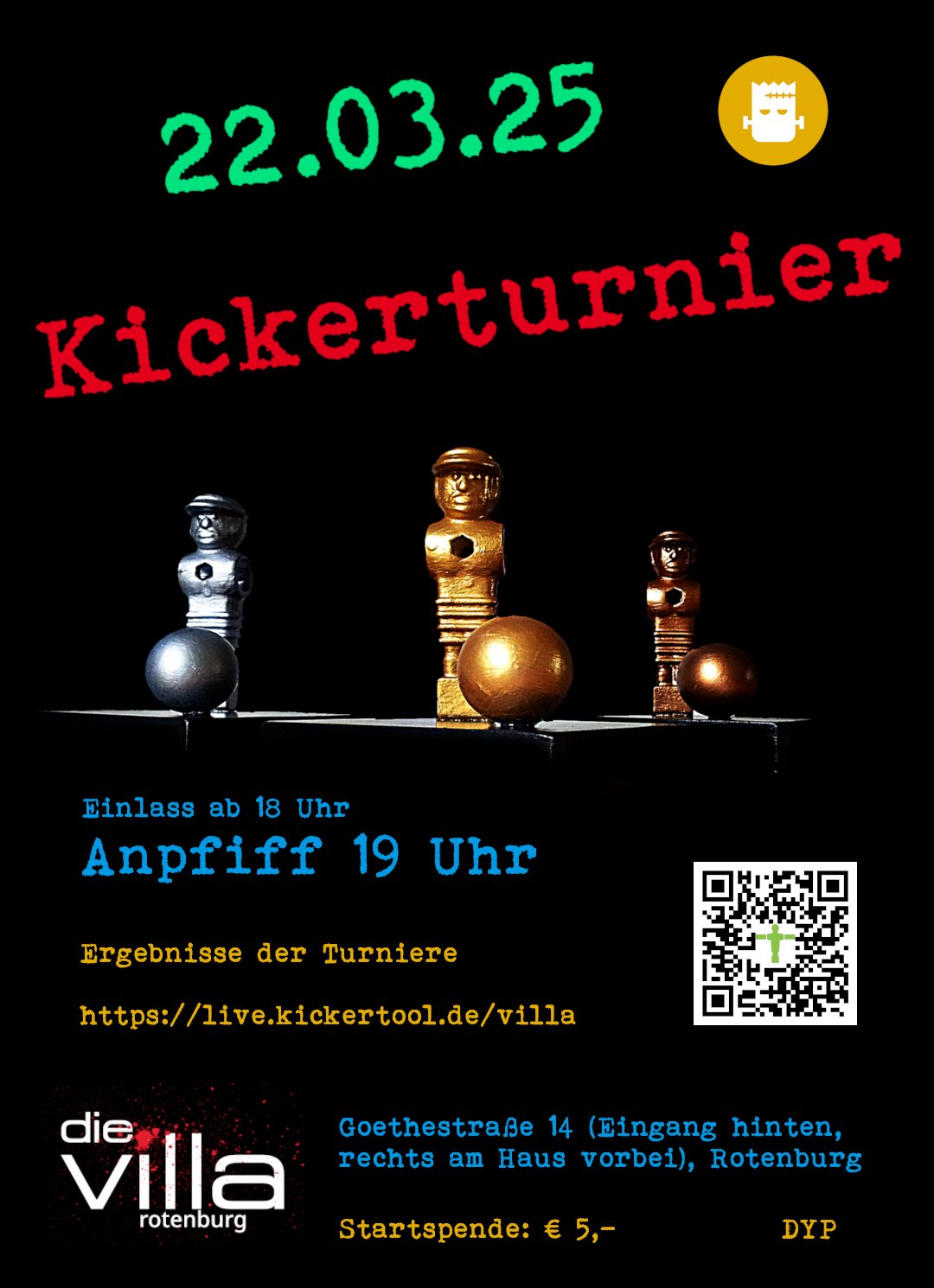 2025 - heute Goethestraße 14, Rotenburg, GermanyLiebe Mitglieder und Freund*innen der Villa, endlich ist es mal wieder soweit - ein Kickerturnier 🙂 Mit bunten Grüßen Eure Vila Crew Weitere Infos